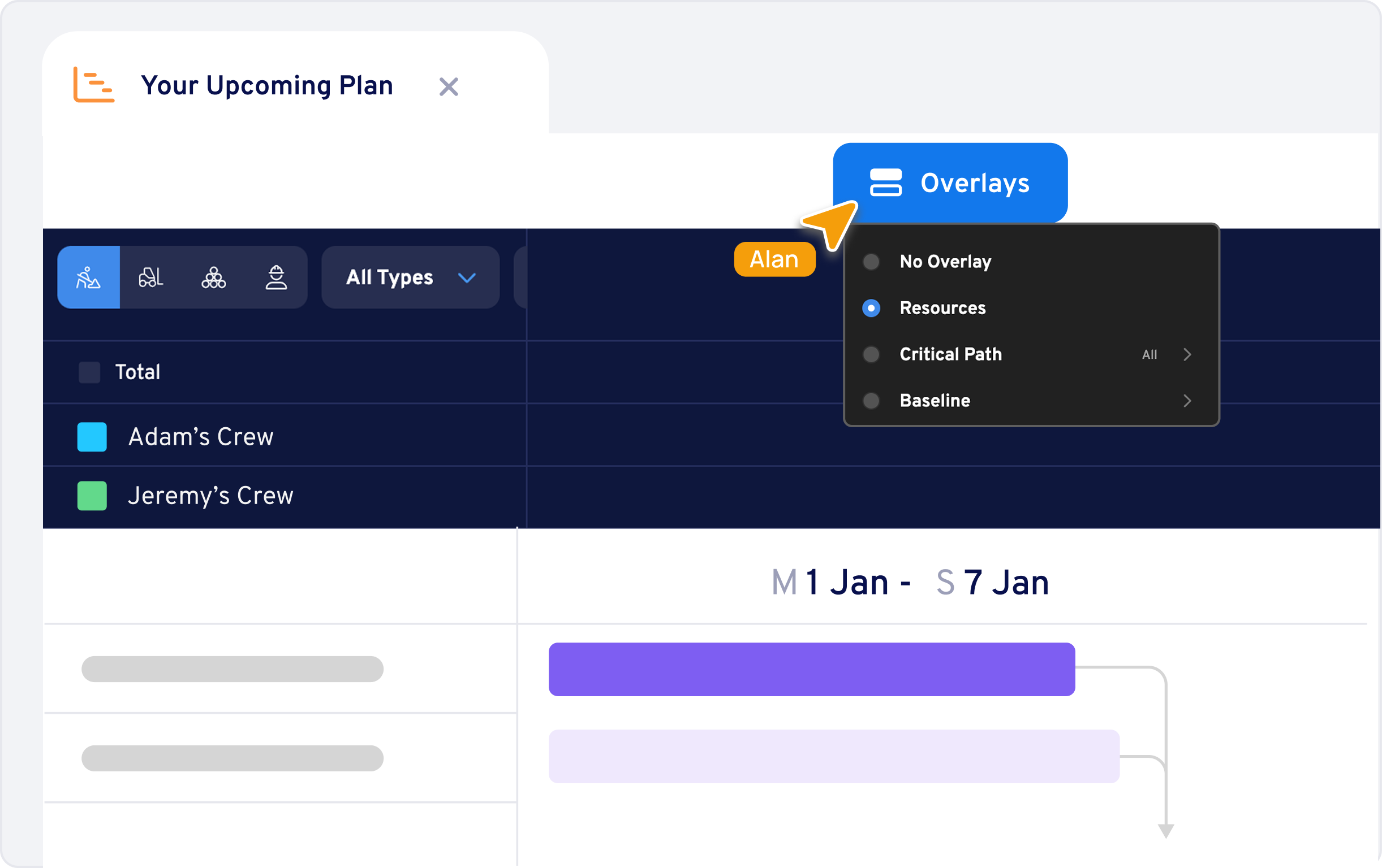 Use the resource overlay feature to visualise resource demand across your program timeline. This makes it easy to spot periods where you'll need multiple fauna spotters or cultural heritage crews, allowing you to book resources weeks in advance rather than discovering conflicts the day work is supposed to begin.