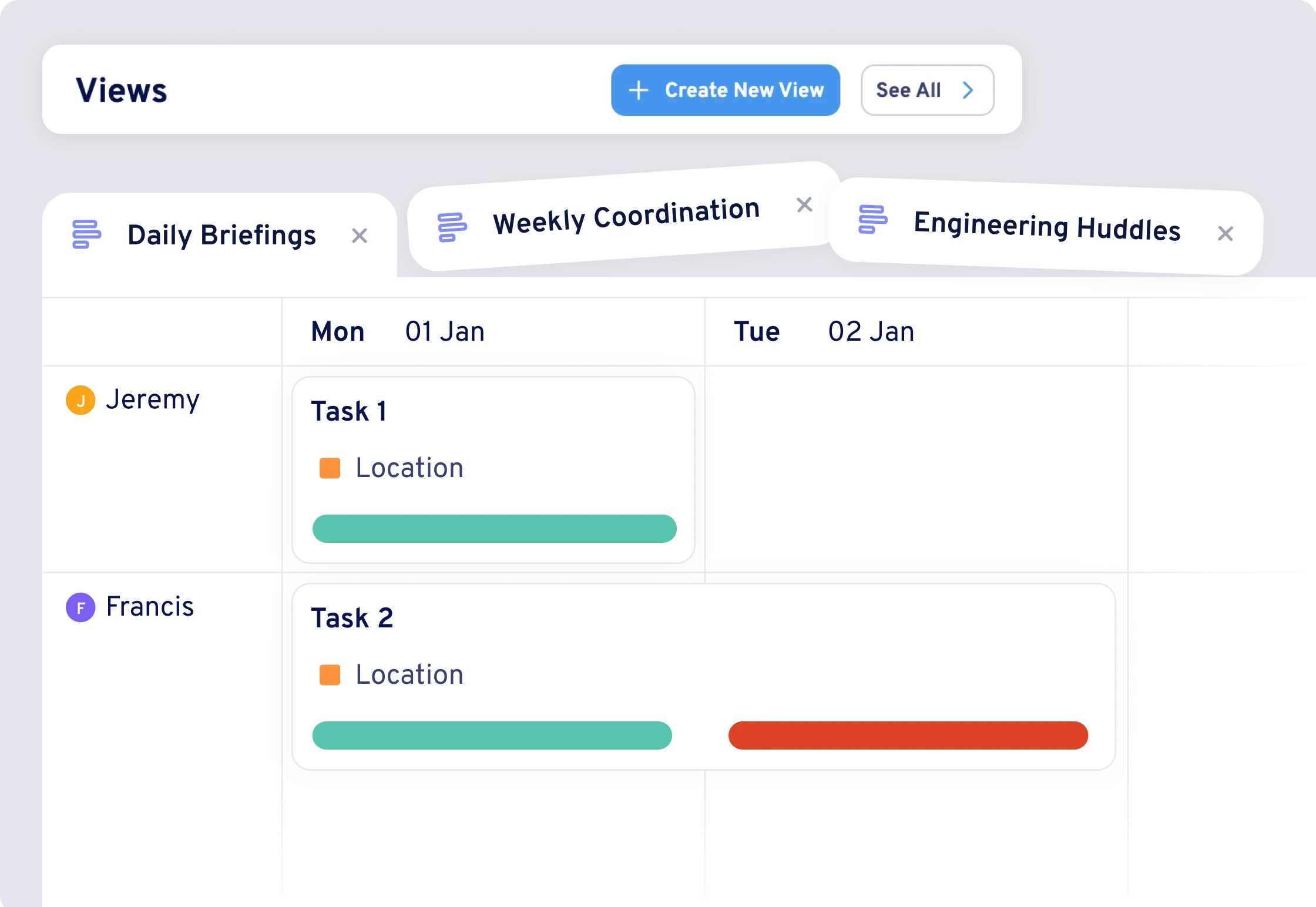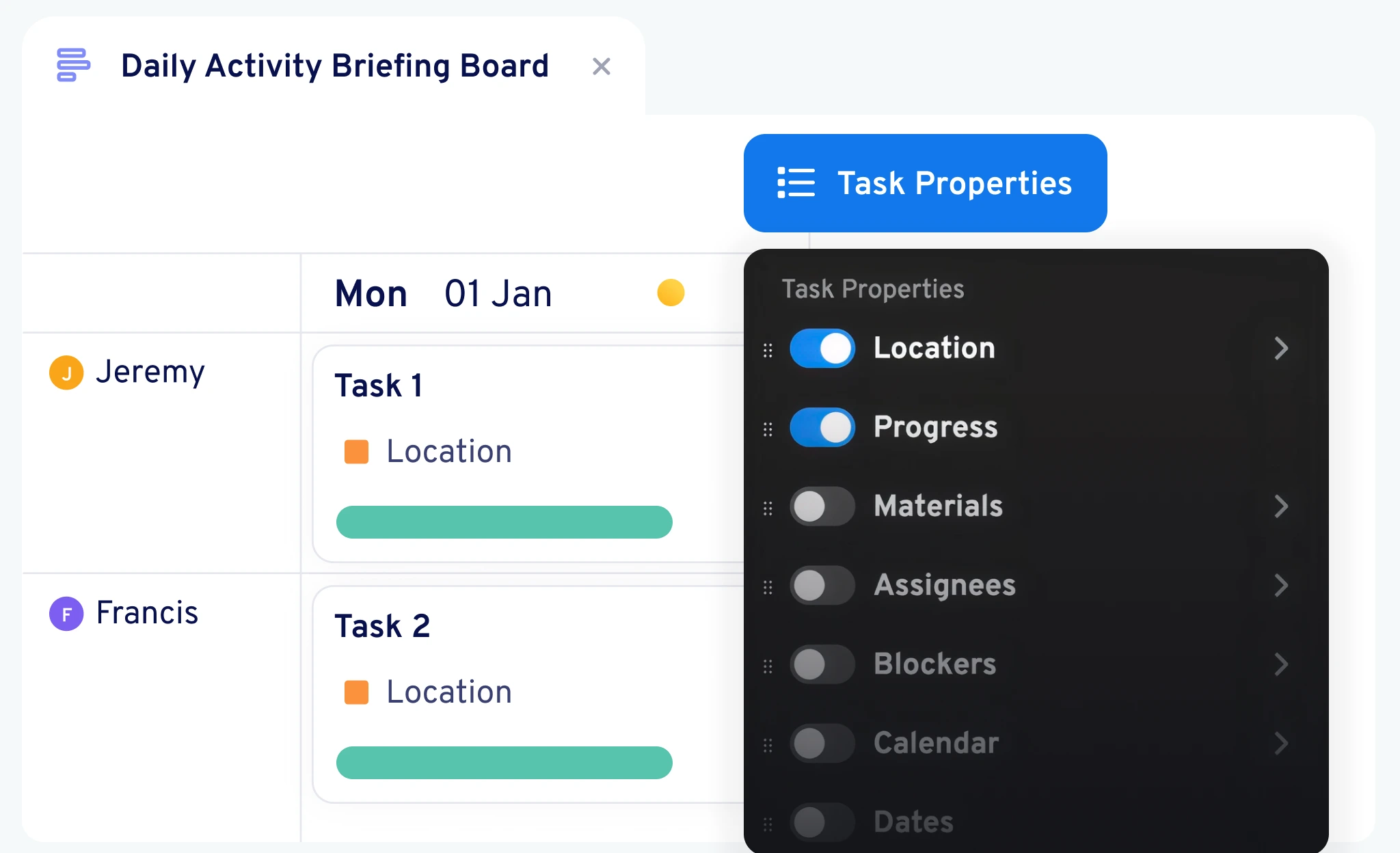 Build multiple board configurations for different purposes—daily briefings, weekly coordination, or specialist trade meetings.