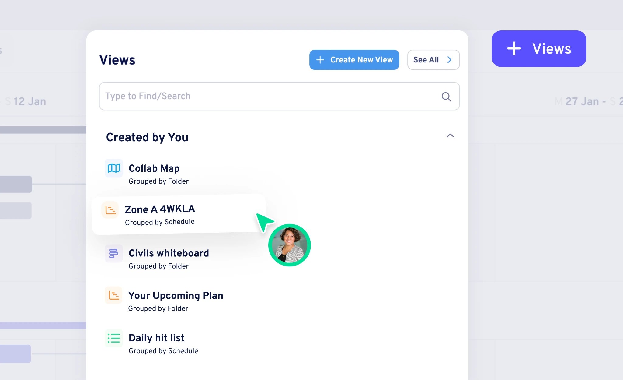 Move seamlessly between your work, your team’s, or a section of the project — all connected to the same live plan.