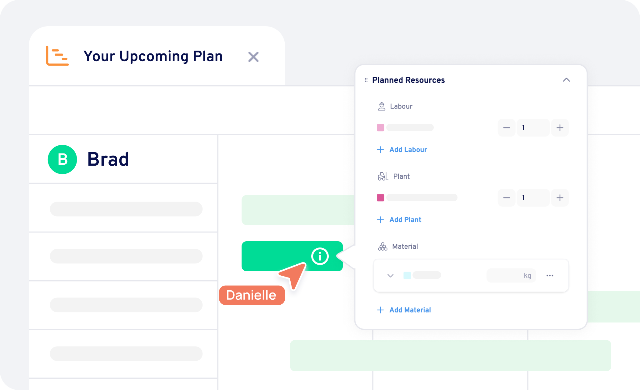 Add material quantities and plant requirements directly to tasks, so you always know what's needed on site and can plan deliveries accordingly.
