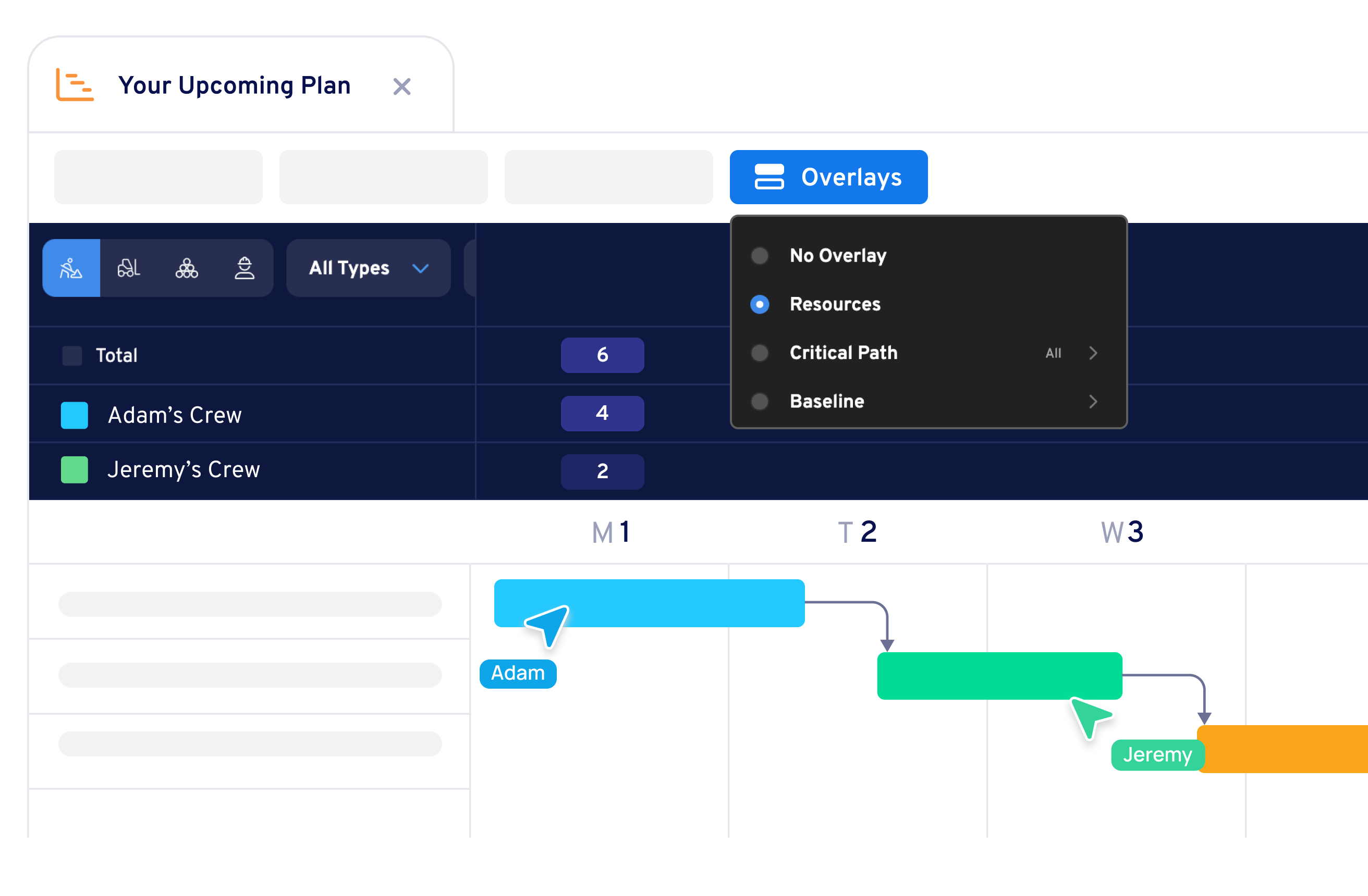 Layer in the people, materials, and equipment needed to get work done, giving everyone clarity on what's required and when.
