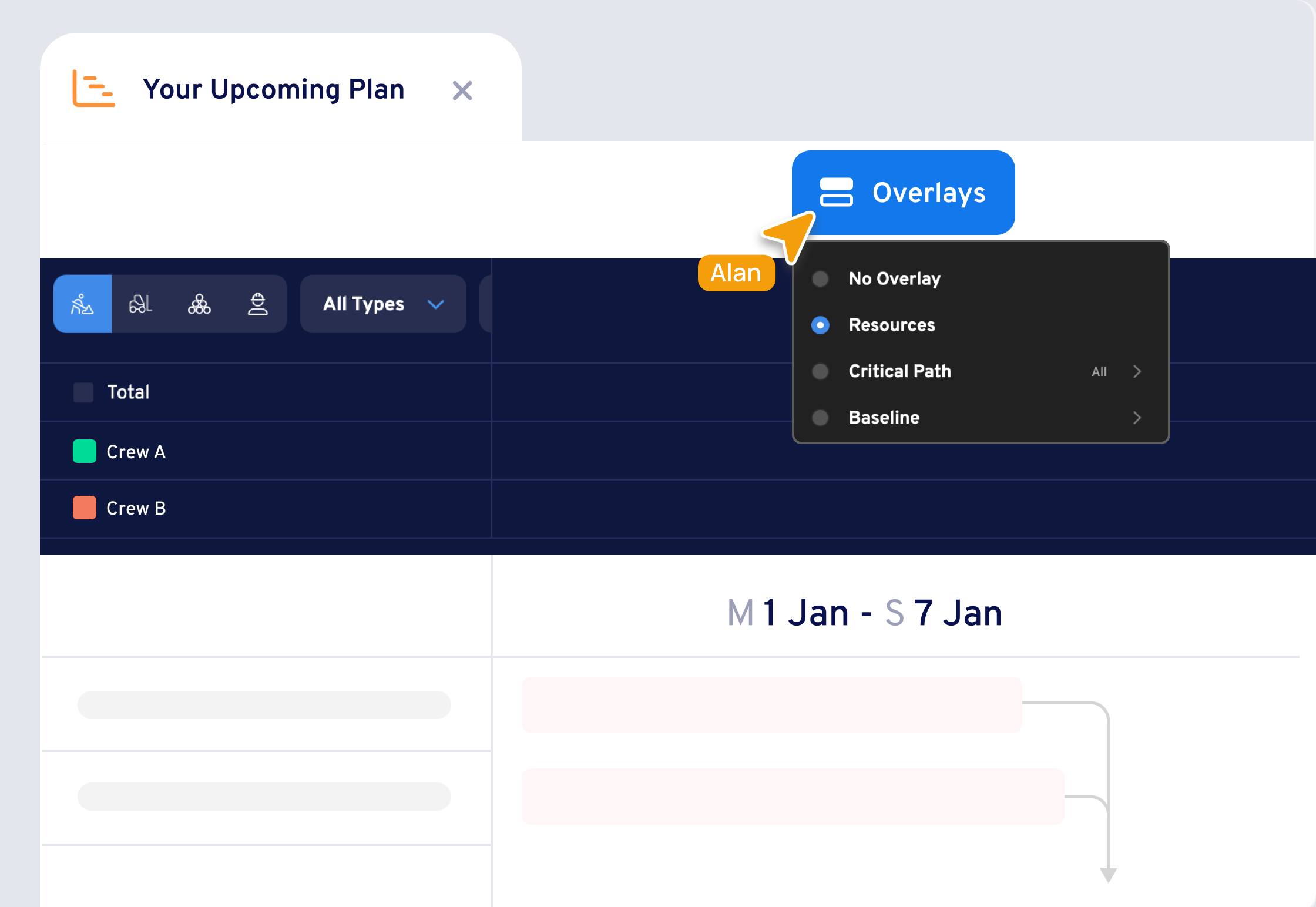 View resource allocation across your timeline to spot overloaded periods and balance workloads before conflicts arise on site.